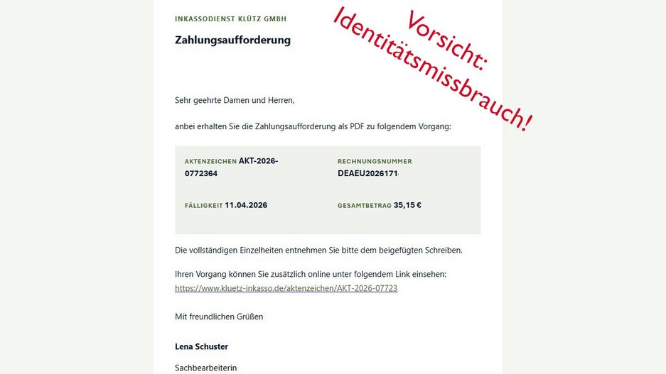 Ignorieren Sie die betrügerischen Schreiben - sie sind einfach daran zu erkennen, dass die Empfänger auf eine Webseite geleitet werden. Das echte Inkassounternehmen mit dem Namen Inkassodienst Klütz GmbH betreibt jedoch keine eigene Webseite - die in den Schreiben angegebene Seite wurde ausschließlich zum Zweck des Betrugs eingerichtet.