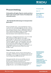 Pressemitteilung Ombudsfrau Brigitte Zypries zieht positives Fazit nach einem Jahr Code of Conduct der Inkassobranche „Die Rechtsdienstleistung ist transparenter geworden“ Berlin, 8. Dezember 2022 –…